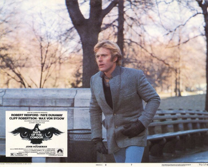 "Три дня Кондора" Сидни Поллака увидел свет в 1975 году. Работник одной "историко-литературной" компании в исполнении Роберта Рэдфорда (Кондор) в один дождливый день обнаруживает семь трупов своих коллег. Кондор, хищная птичка, раскручивает клубок до конца.